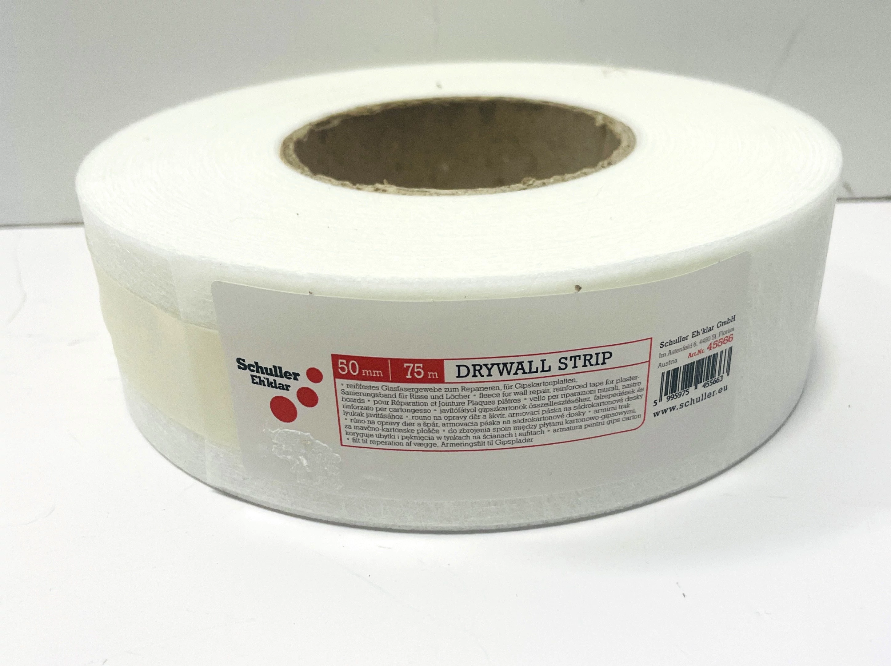 A beltéri használatra alkalmas Bandázsszalag (üvegszövet fátyol) Schuller Drywall Strip 50 mm x 75 m-es termék gipszkartonozás utáni rések, illesztések elfedésére szolgál. Cikkszám: 45566