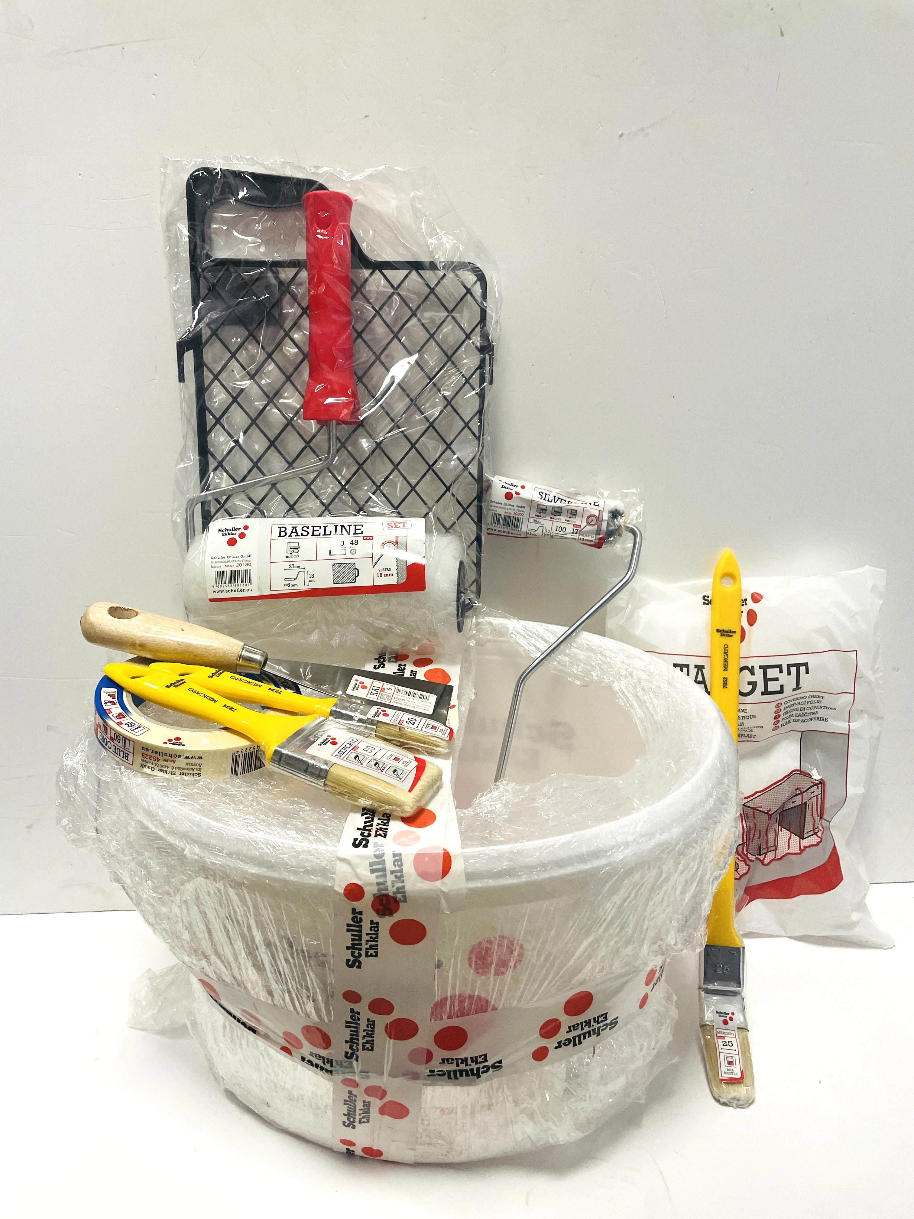 A Festőkészlet - Schuller Topjob termékben minden megtalálható, ami szükséges lehet egy minőségi festéshez. Egy profi festő éppúgy megtalál benne mindent, mint egy kezdő. A festőkészlet részei: 12,5 literes festékes vödör, 18 cm-es festőhenger, csepegtetőrács, 10 cm-es fűtőtest henger, 25 mm-es fűtőtest ecset és 20 és 50 mm-es lapos ecset, 50 mm-es spatulya, 19 x 50 mm ragasztószalag és 4 x 5 m-es takarófólia. Cikkszám: 40594