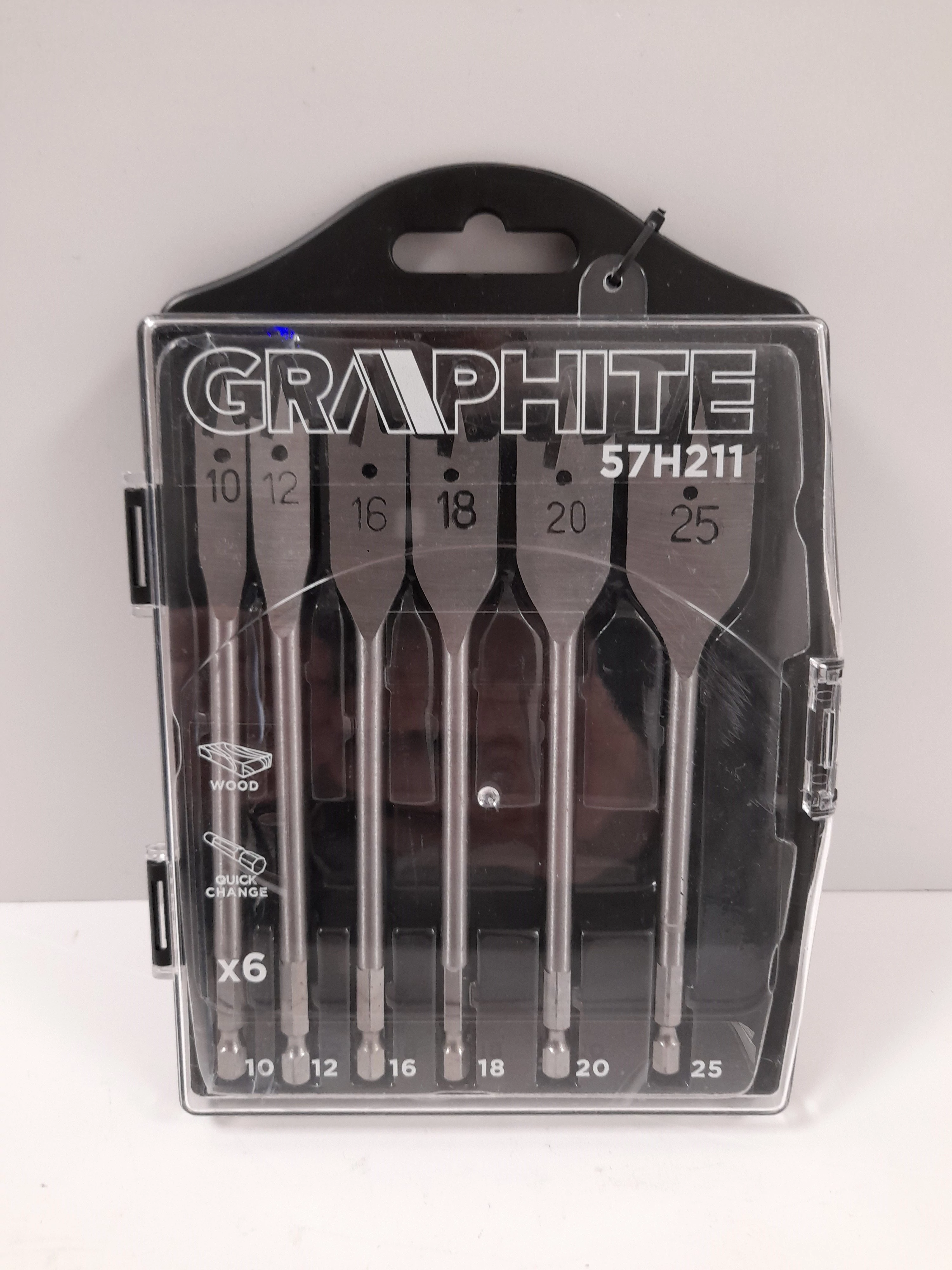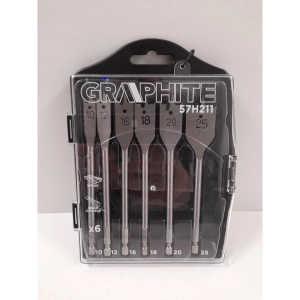 A Homlokmarós fafúró készlet - Graphite, 10-25 mm (6 részes) (57H211) termékünk hatszögletű „Quick Change” fogantyúnak köszönhetően akkus csavarhúzók mágneses tartóiban is használható. Továbbá a speciális pengeprofiljának köszönhetően a fúrási sebesség megkétszerezhető az anyag szakadásának elkerülésével.
